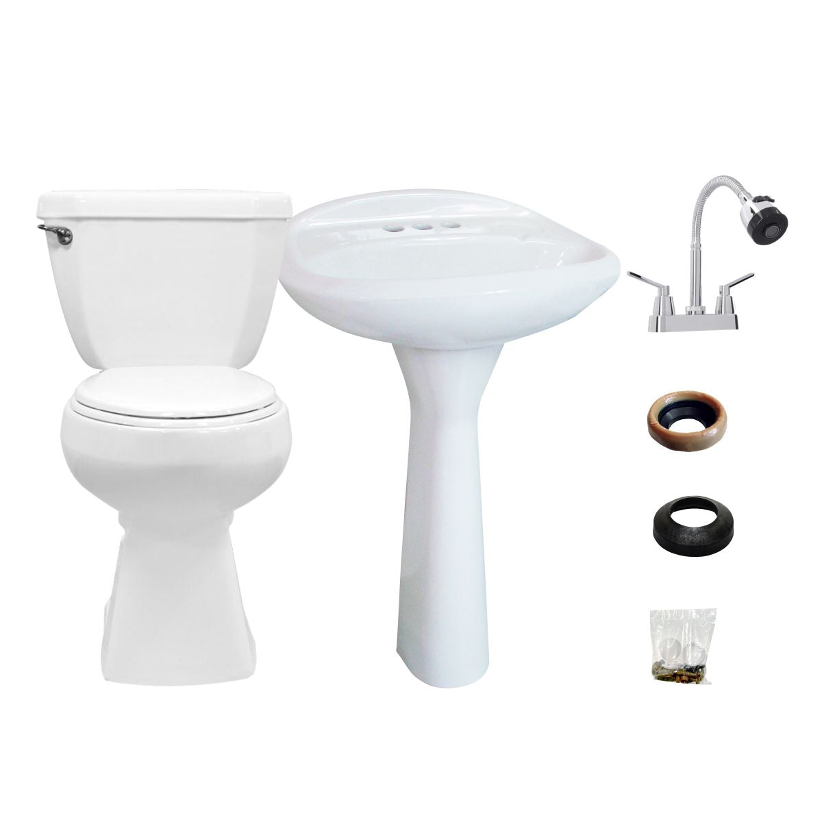 Incluye: Taza, tanque, lavabo, pedestal, asiento, cuello de cera, juego de pijas y mezcladora.